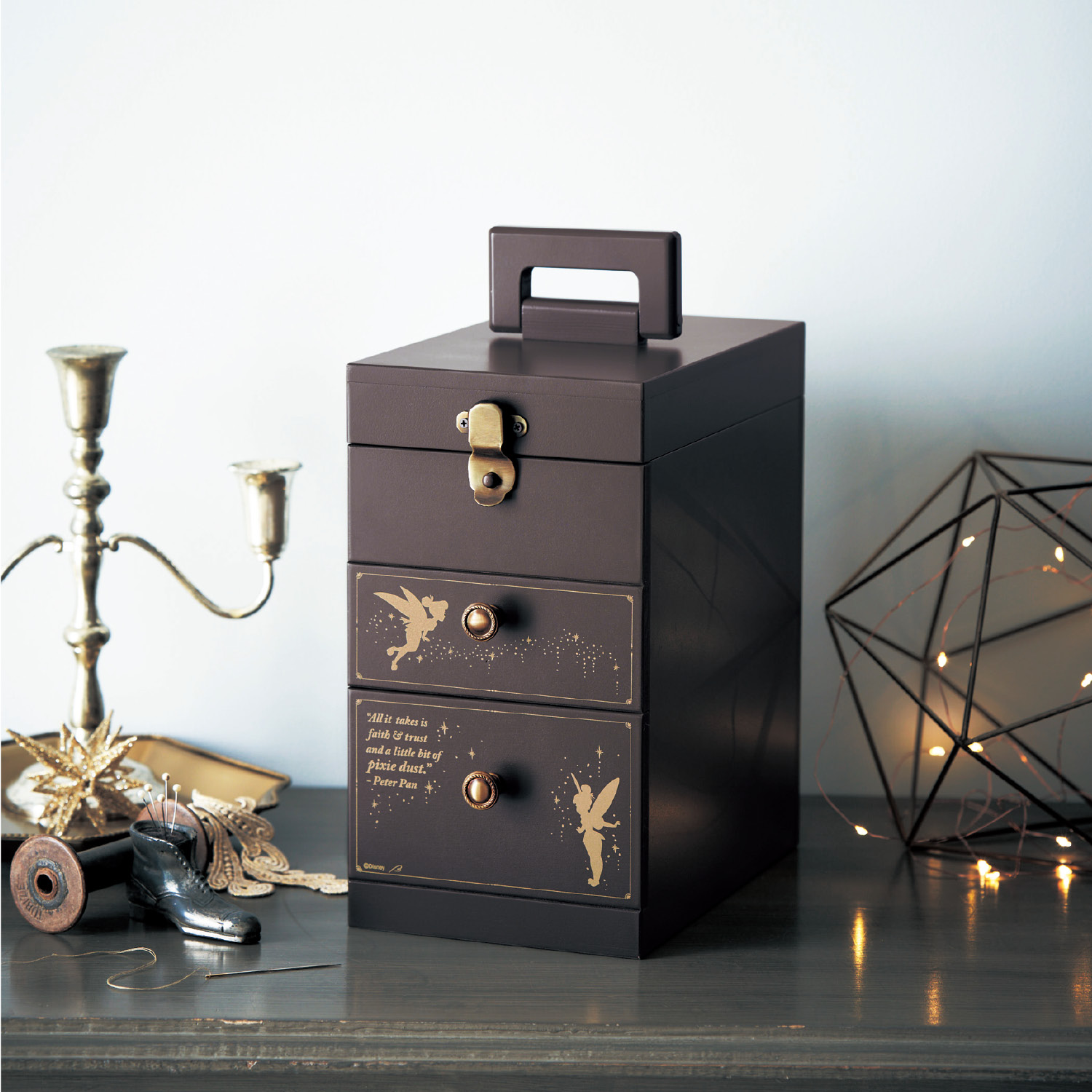 上段ボックスと2段の引き出しに裁縫小物を整理して収納できます。ティンカー・ベルのプリントに、お裁縫するたびニッコリ