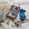 淡いくすみブルーにパープルのパイピングがほどこされた生地は、忠実に再現した唐草ドットの総柄。
