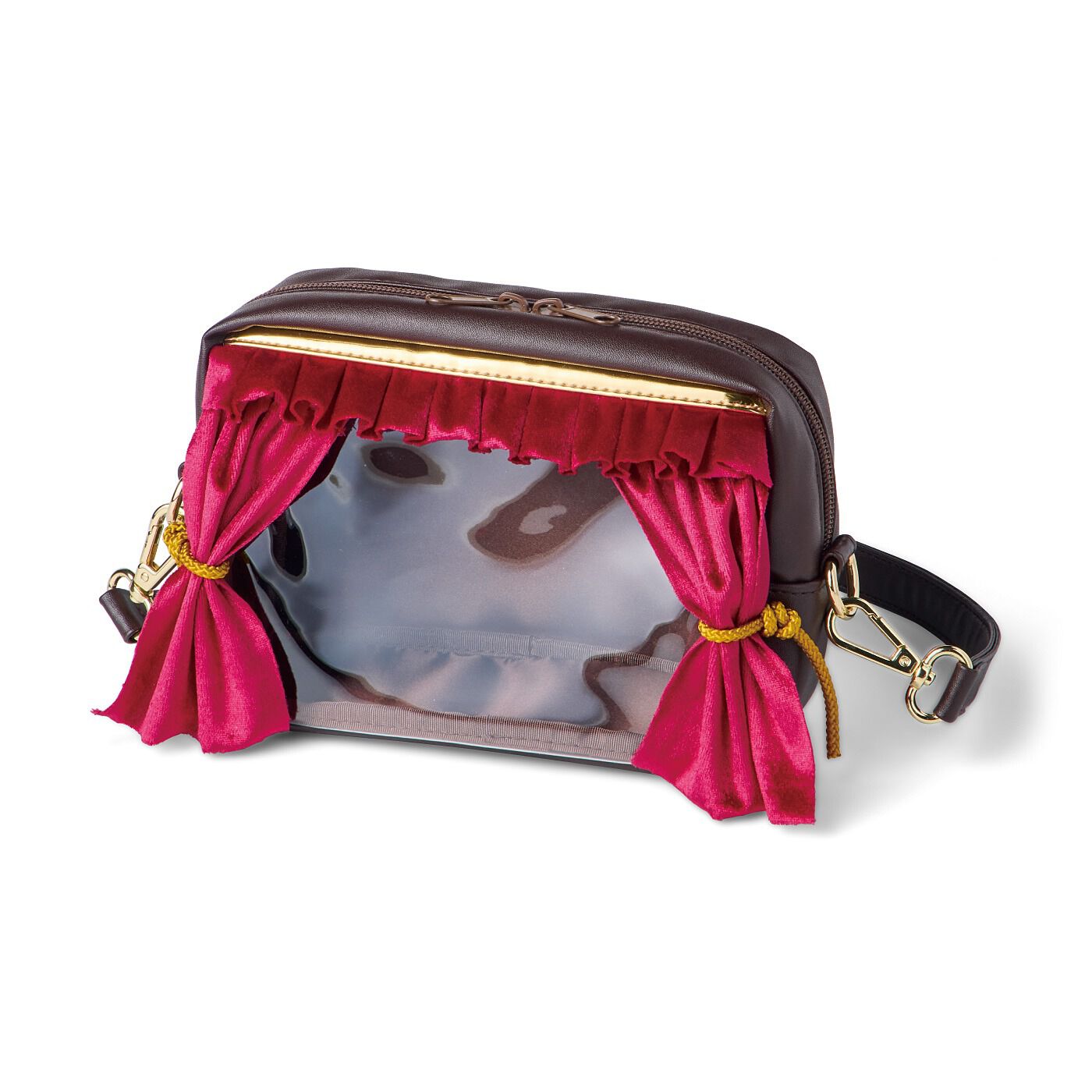 舞台の緞帳(どんちょう:ステージカーテン)を開いて、幕が上がる瞬間のわくわくを再現できるポーチ。